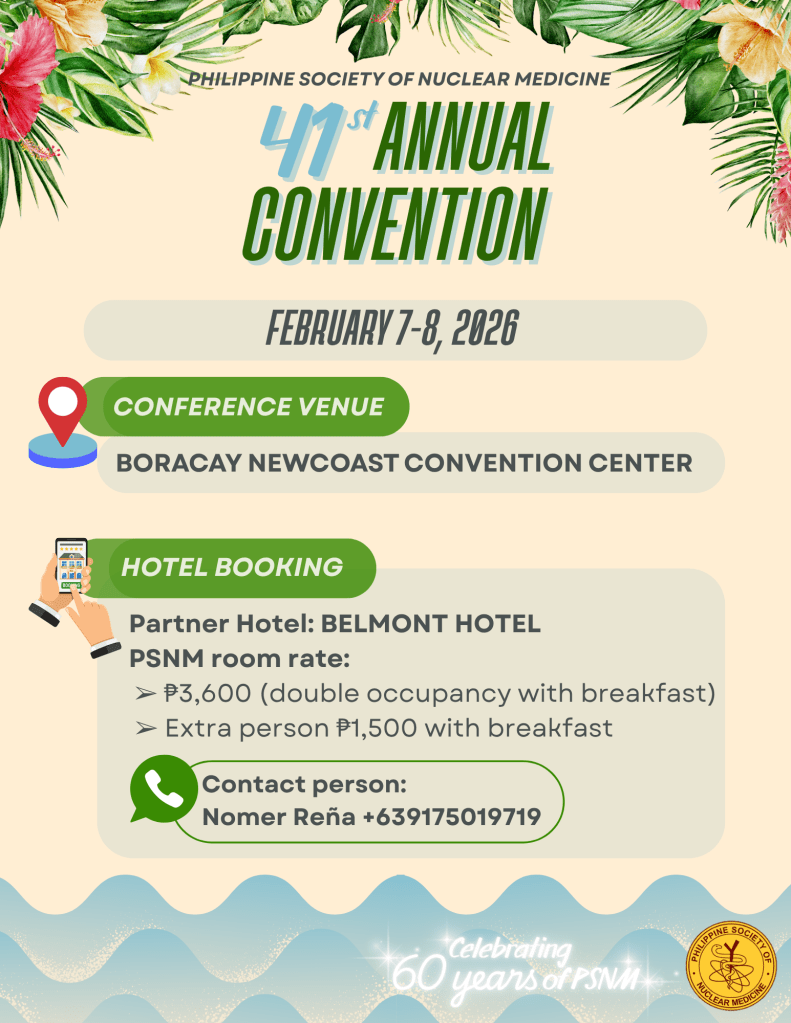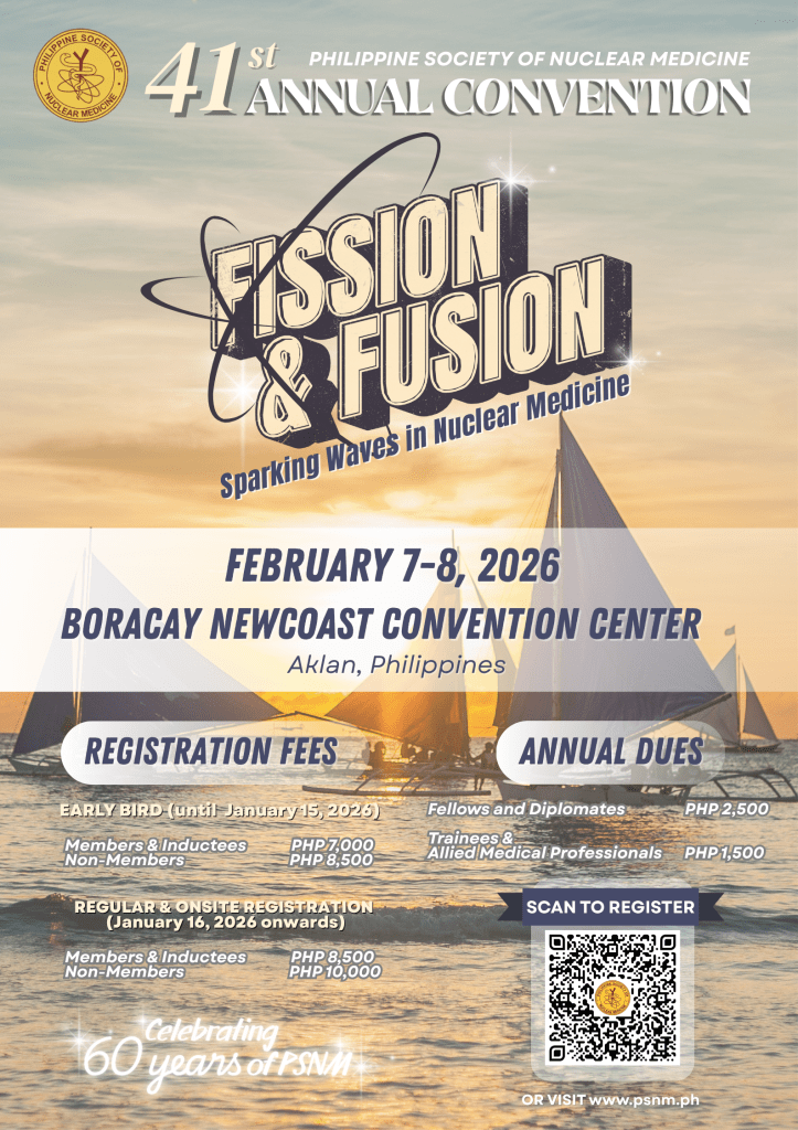 Good day! On behalf of the PSNM Convention Organizing Committee, I would like to cordially invite you to attend our 41st Annual Convention with the theme “Fission & Fusion: Sparking Waves in Nuclear Medicine” to be held in the Boracay Newcoast Convention Center, Aklan on February 7 to 8, 2026. Next year marks the 60th Anniversary of the Philippine Society of Nuclear Medicine, so come and celebrate this milestone with us!